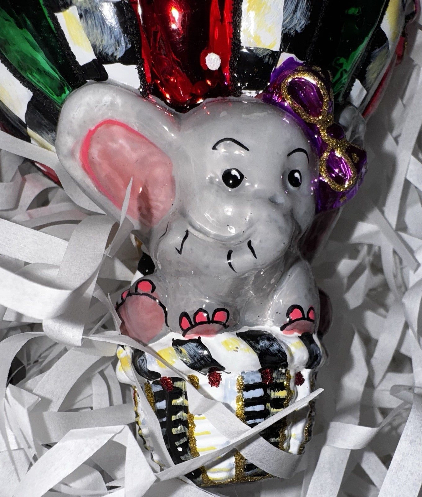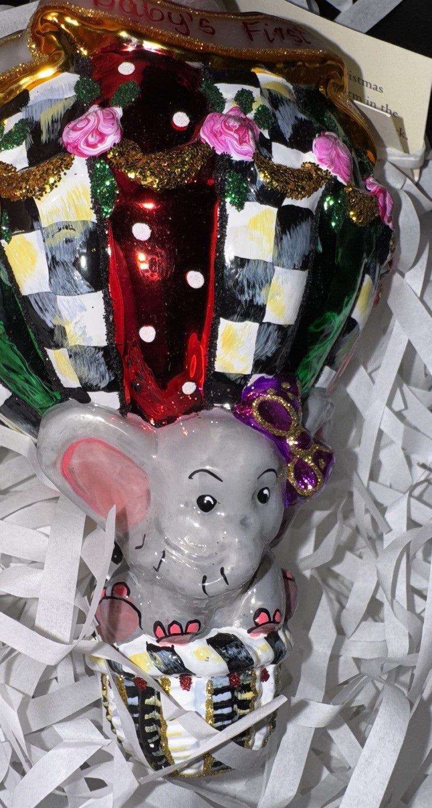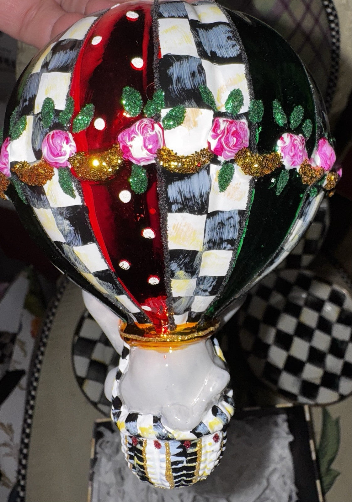 "Add to the memories year after year with our collection of beautiful glass ornaments, including this hot air balloon decorated with touches of Courtly Check. This ornament is mouth-blown and hand-painted in Eastern Europe by some of the world's most talented glass artisans and is presented in a keepsake gift/storage box."