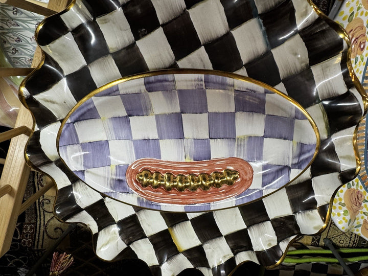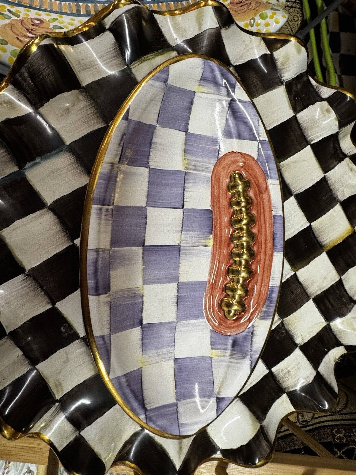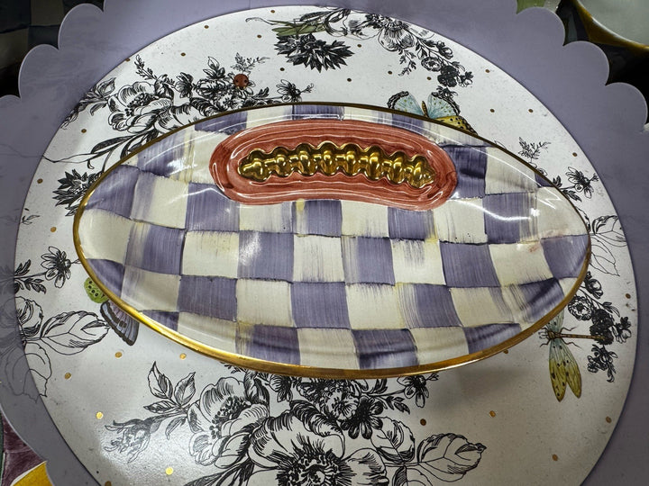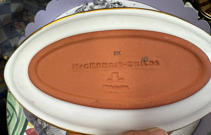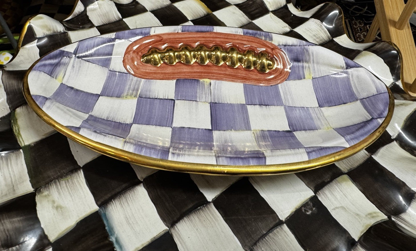 MacKenzie Childs Check Football trinket Plate in plum (purple). Made in New York, this hand-made, hand-glazed, and hand-painted ceramic plate is football shaped and decorated with the signature MacKenzie Childs check including gold luster on the laces of the football and around the edge. It is perfect for small servings or for use as a trinket tray. This plate is approximately 8.75"L x 5.0"W x 1" H. This item is brand new and as such, it is in mint condition with no chips, cracks, scratches, crazing, or repairs.